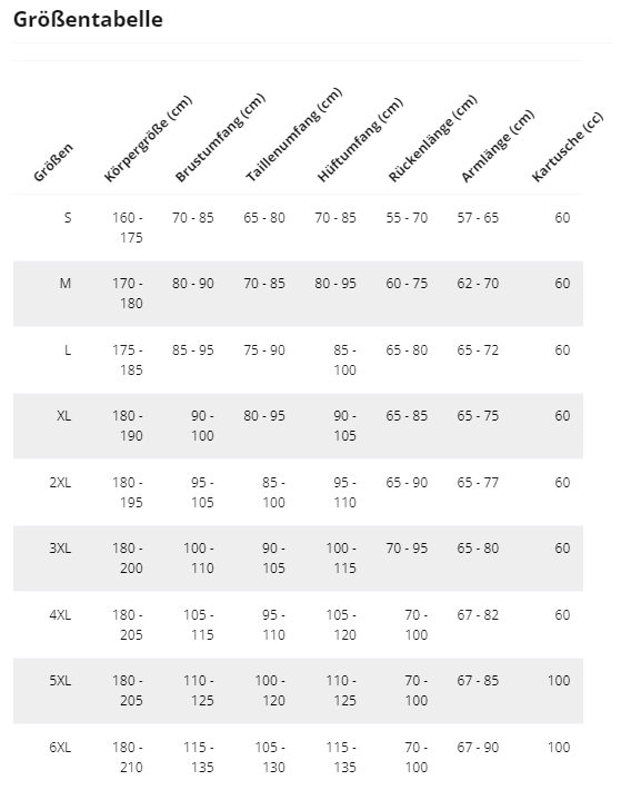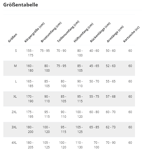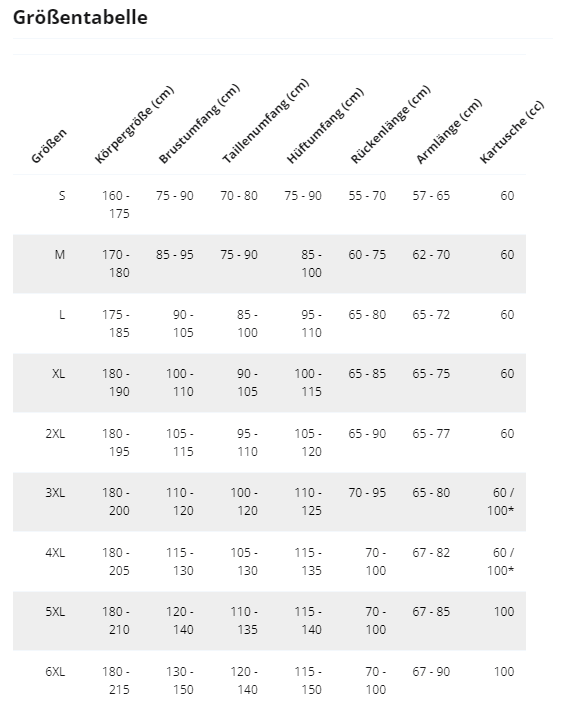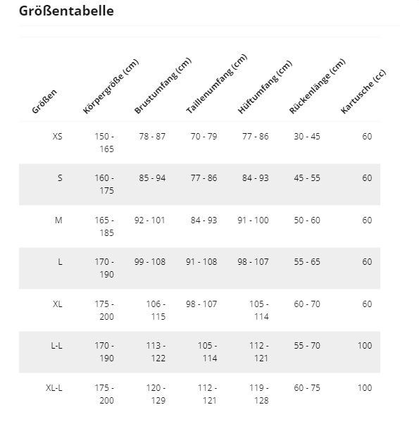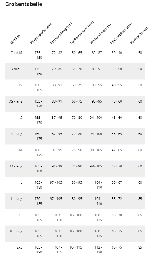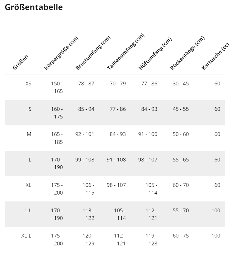 Das Gewicht der CO2-Kartusche gibt Aufschluss über ihren Füllstand. Abhängig von der Größe Ihrer Airbag-Jacke oder -Weste muss die Kartusche richtig dimensioniert sein. Eine Kartusche mit zu geringem Gewicht kann die Funktion des Airbags beeinträchtigen und wird bei Bedarf kostenlos ersetzt. -